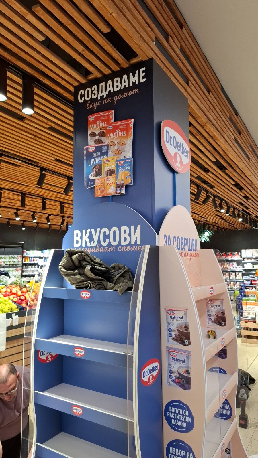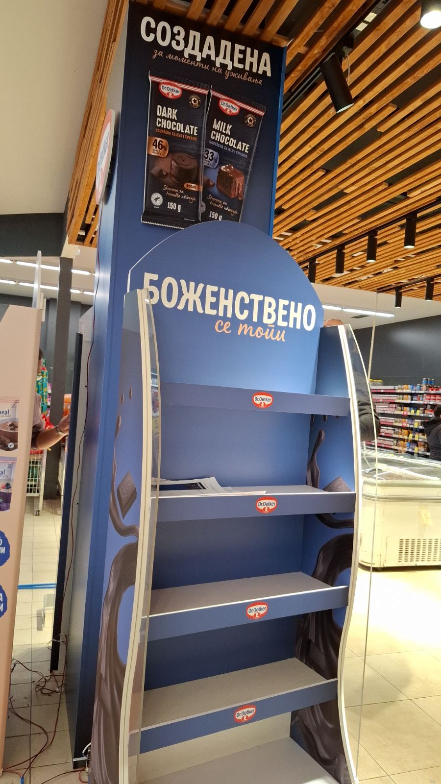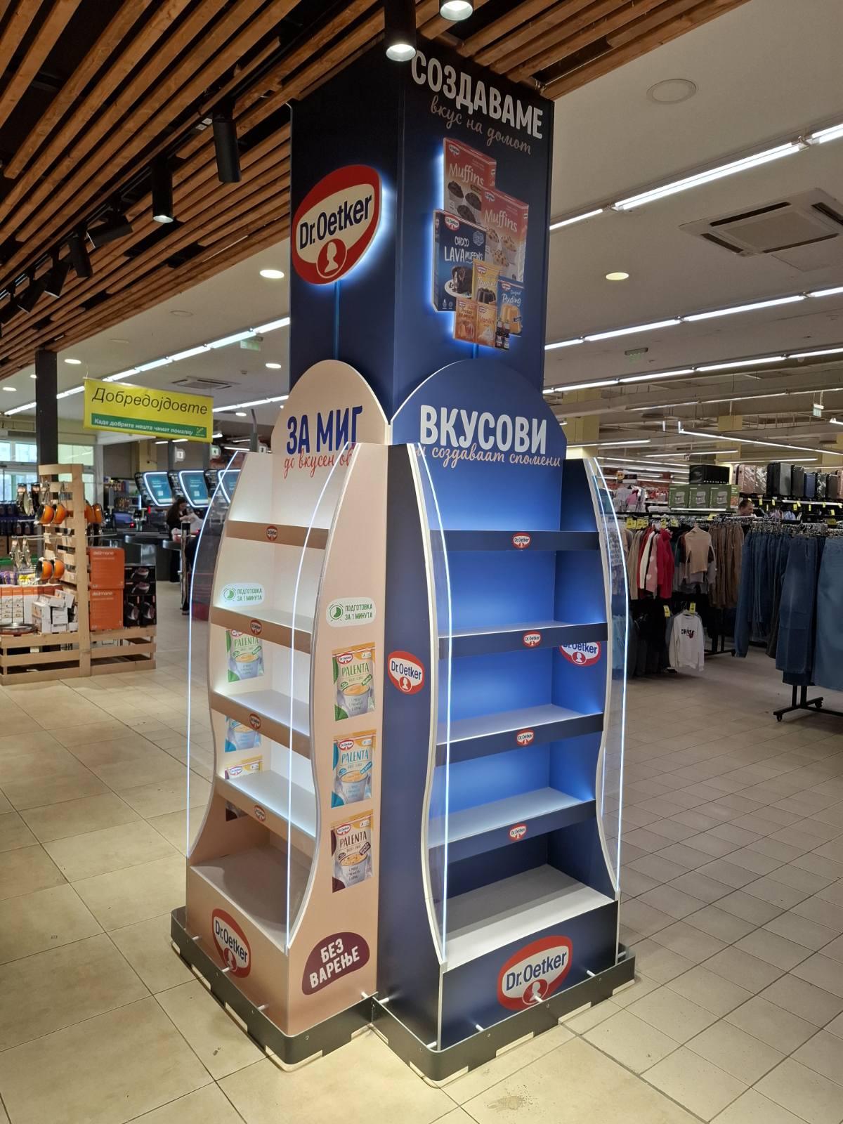Како дел од современите in-store маркетинг решенија, реализиравме осветлен брендиран столб од четири страни за брендот Dr. Oetker, поставен во продажниот објект Кит-Го Велес. Ова POS решение е дизајнирано да обезбеди 360° видливост, максимално привлекување на внимание и постојано присуство на брендот во просторот каде што се носи куповната одлука.