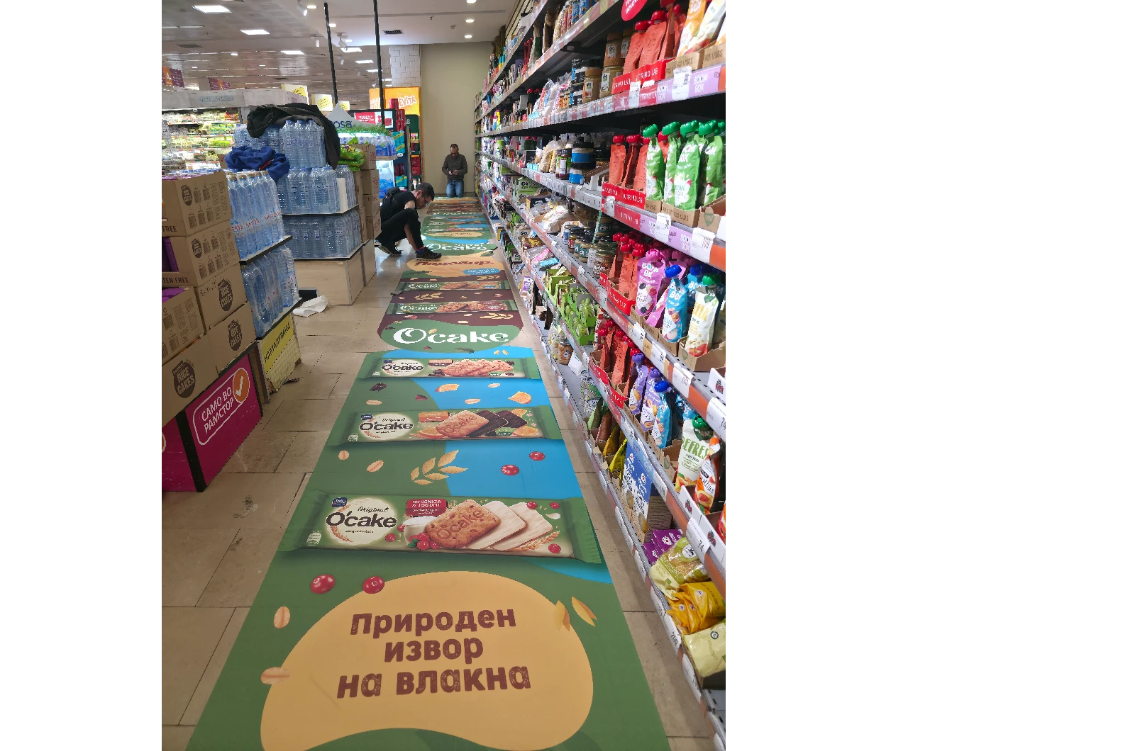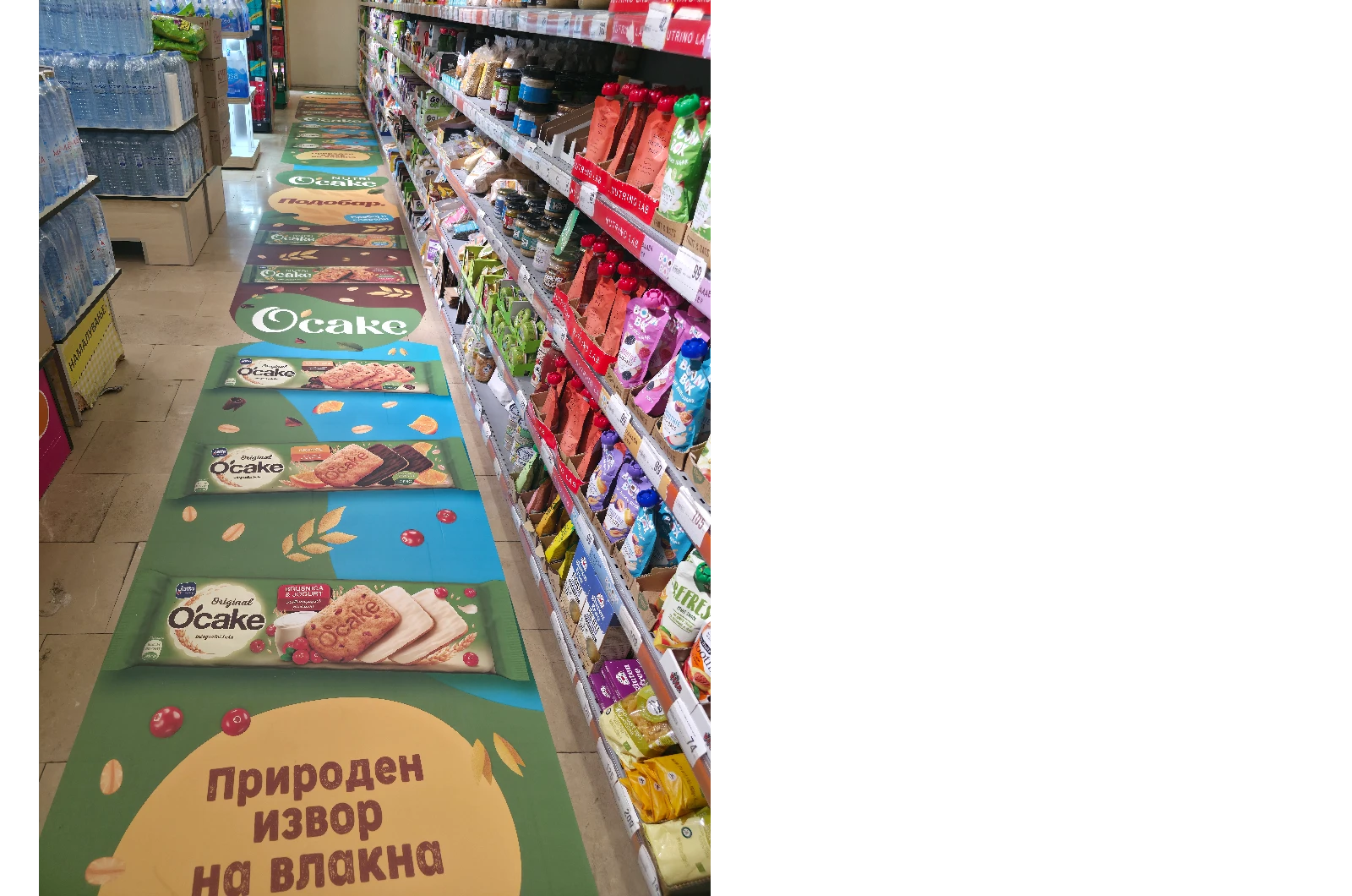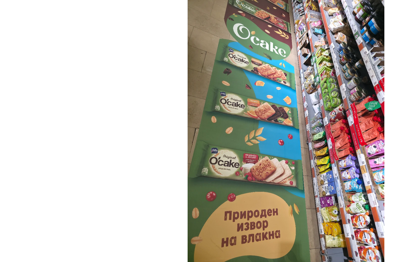 Во насока на зајакнување на видливоста и позиционирањето на брендот во продажниот простор, успешно реализиравме имплементација на XXL подна графика за Jaffa и производот O'Cake, поставена долж коридорот за здрава храна во Рамсторе Мол.