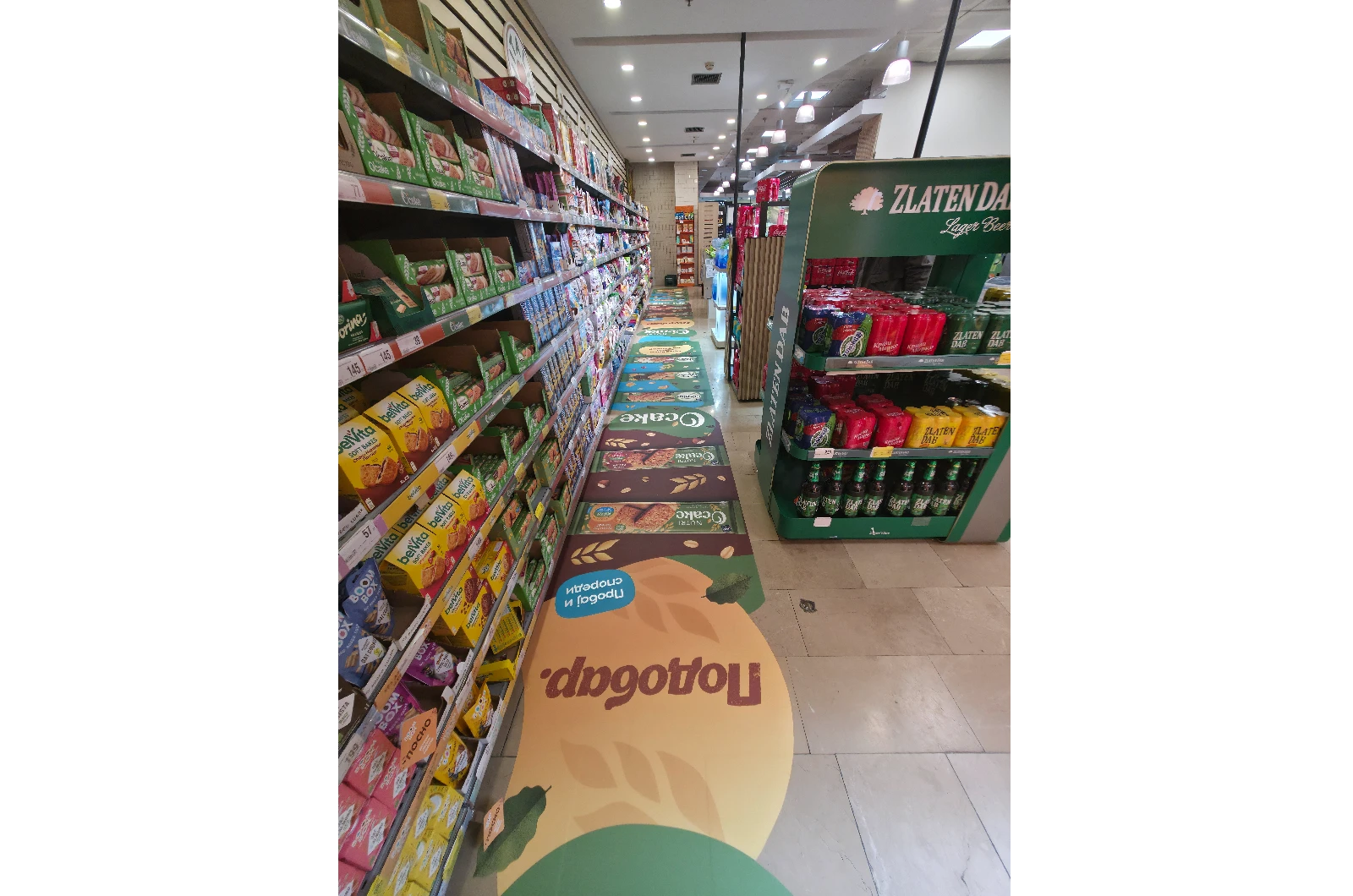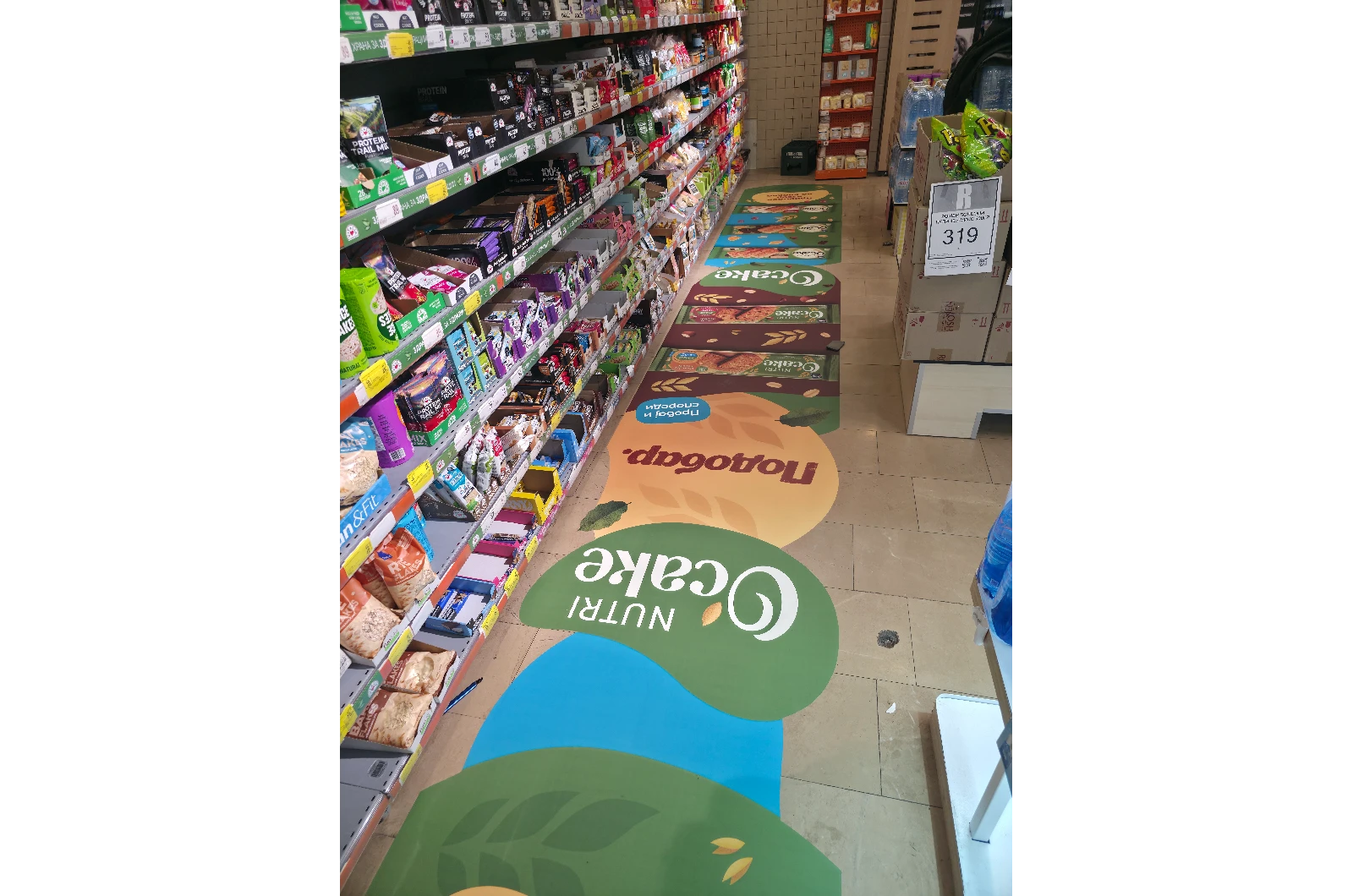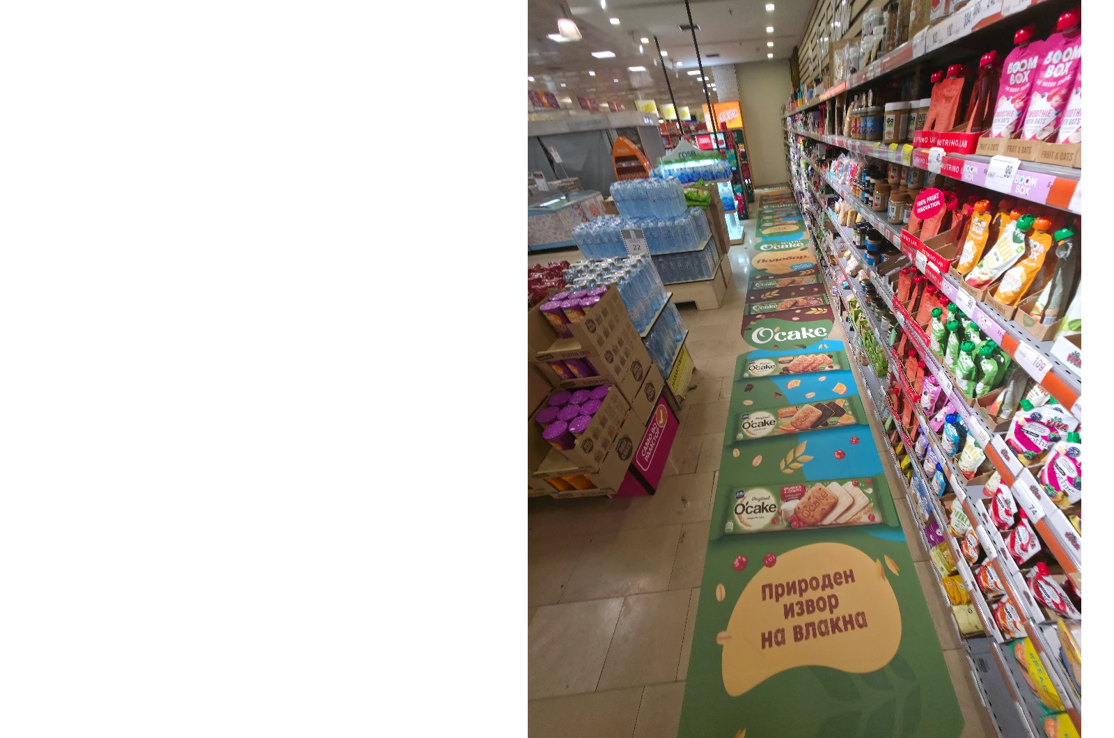 Изборот на локација – коридорот за здрава храна – беше направен со јасна цел: директно обраќање до потрошувачи кои се во фаза на активно разгледување и донесување одлука за купување. Со позиционирање на подната графика по целата должина на коридорот, се постигна континуирана визуелна комуникација која природно го насочува движењето на потрошувачите кон производот.