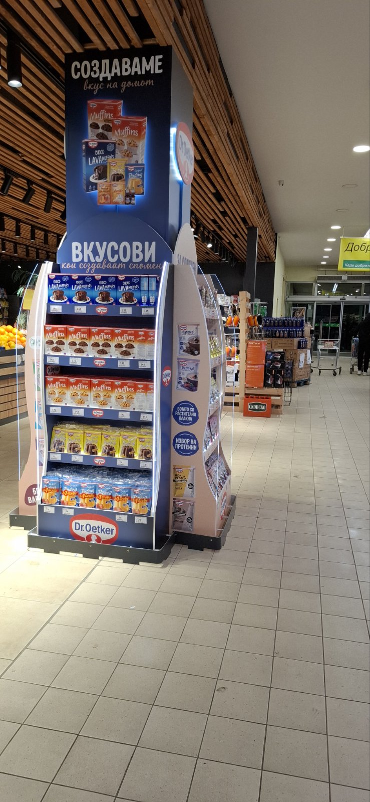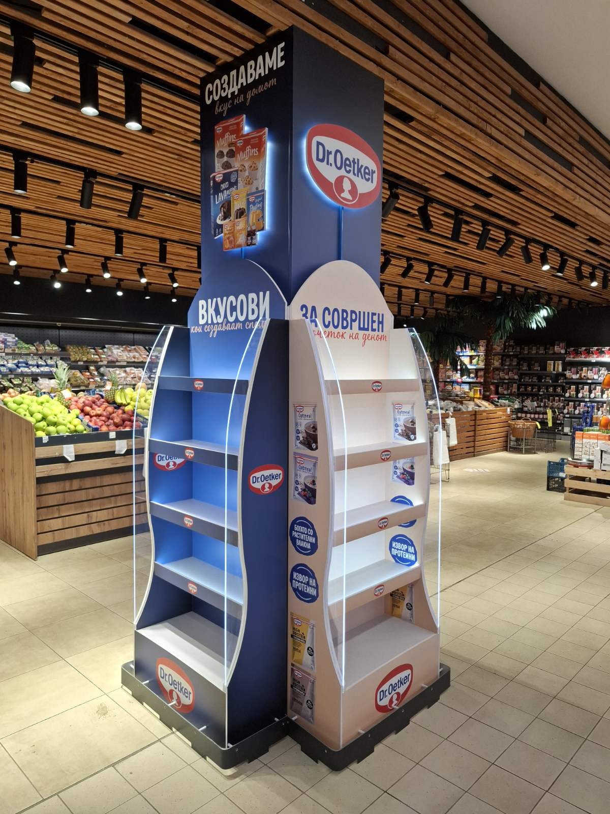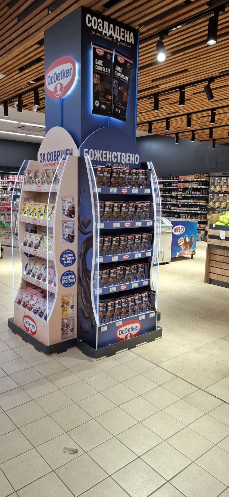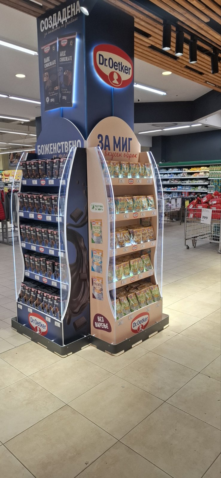 Како дел од современите in-store маркетинг решенија, реализиравме осветлен брендиран столб од четири страни за брендот Dr. Oetker, поставен во продажниот објект Кит-Го Велес. Ова POS решение е дизајнирано да обезбеди 360° видливост, максимално привлекување на внимание и постојано присуство на брендот во просторот каде што се носи куповната одлука.