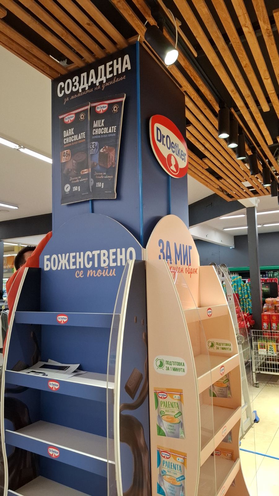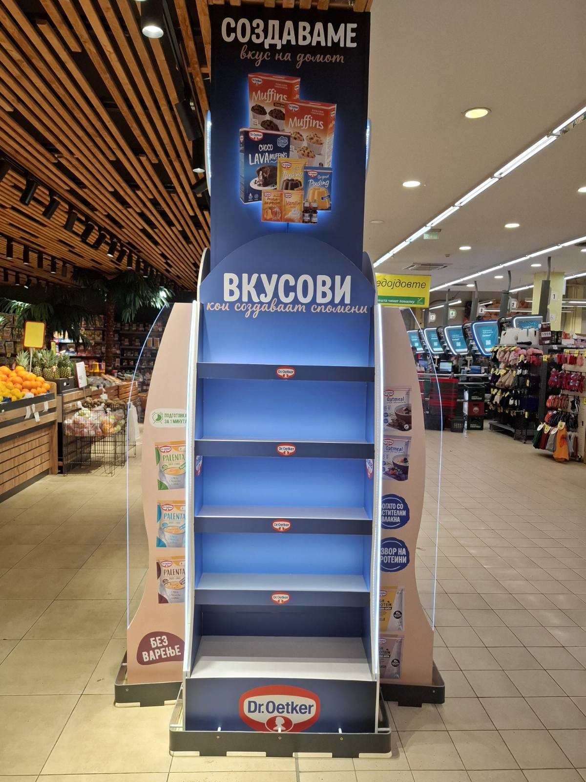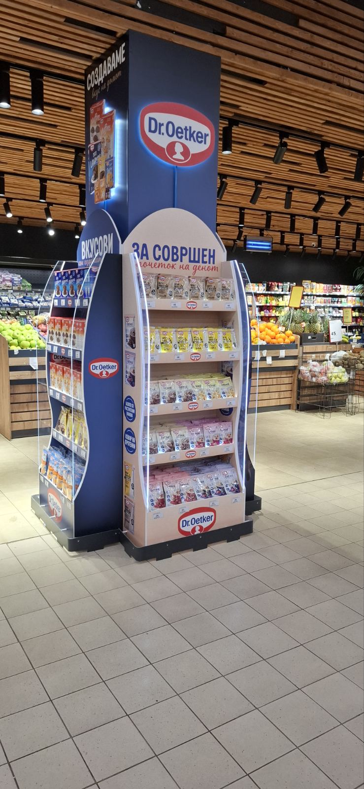 Како дел од современите in-store маркетинг решенија, реализиравме осветлен брендиран столб од четири страни за брендот Dr. Oetker, поставен во продажниот објект Кит-Го Велес. Ова POS решение е дизајнирано да обезбеди 360° видливост, максимално привлекување на внимание и постојано присуство на брендот во просторот каде што се носи куповната одлука.
